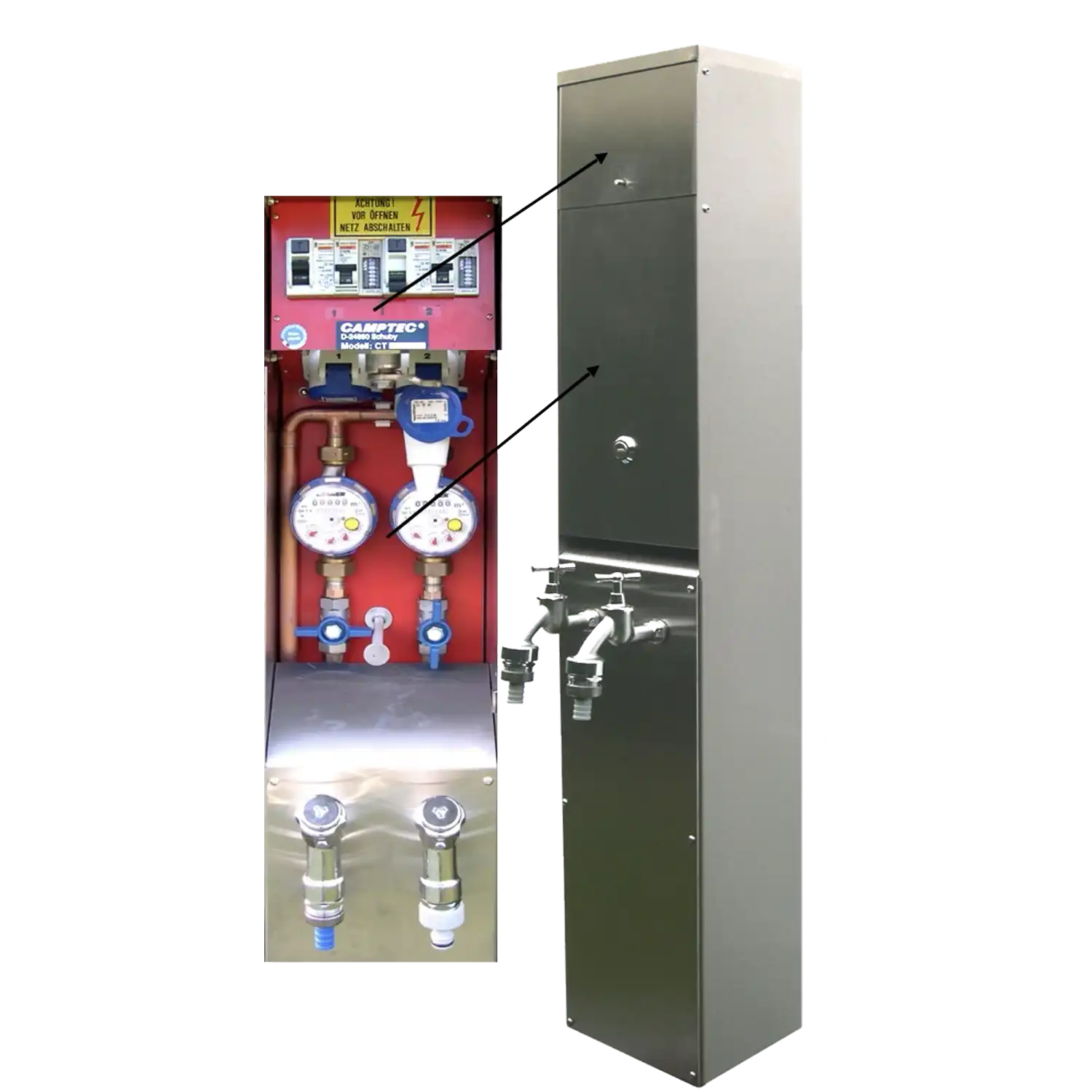 Für eine Einzelabrechnung, können wir diese Versorgungssäule, auch mit elektronischen WS- Zählern und automatischer Zählerstandsabfrage liefern.